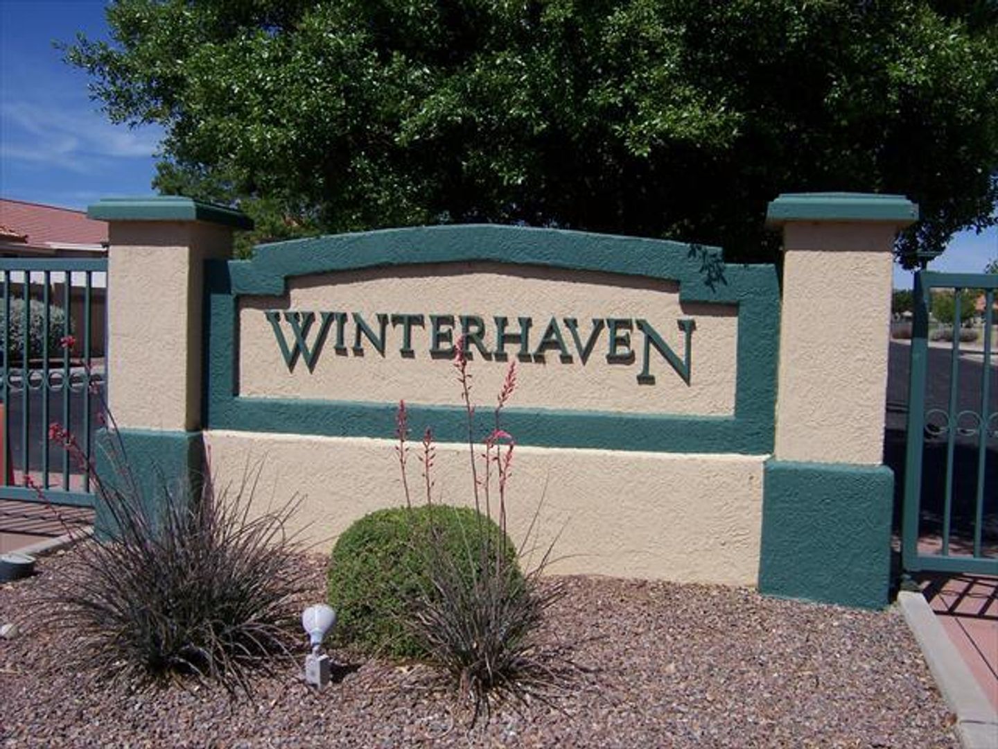 Updated home on a corner lot in Winterhaven 55+ community. Split floor plan. Kitchen has granite counter tops, island and coffee station. Spacious Living room with gas fireplace. Master bathroom has walk in shower and dual sinks. Den/Office at the back of the property has built in desk and barn door storage area. AZ Room. Ceiling Fans. Separate Laundry Room. Cooled by AC. 2 Car Garage. Enclosed backyard. Community pool, spa, and clubhouse.