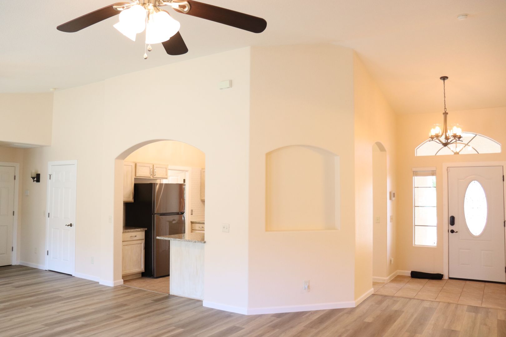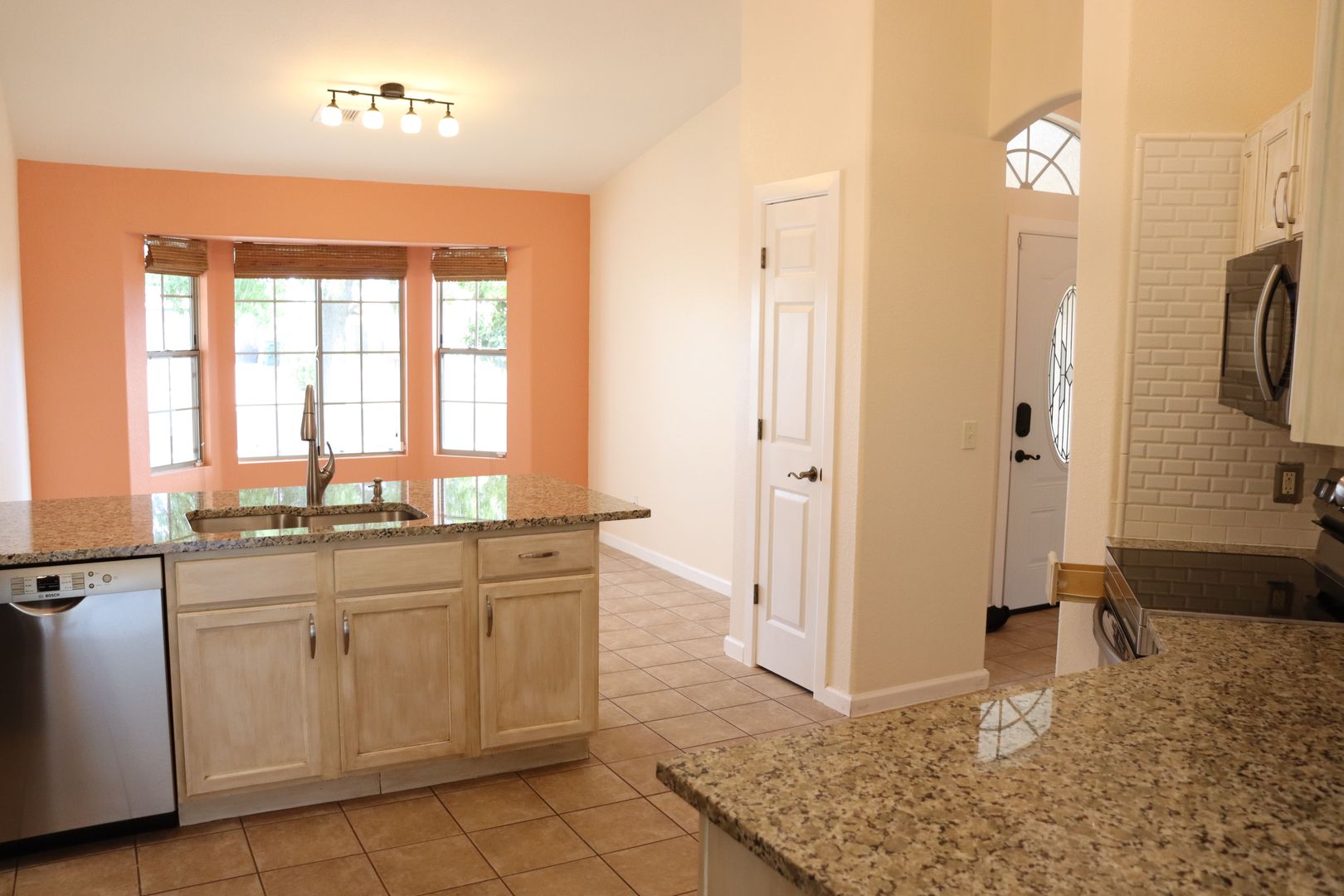 Welcome to this stunning three-bedroom home in the Canyon de Flores neighborhood of Sierra Vista, AZ. This home boasts a split floor plan with two full bathrooms, including a primary bathroom with dual sinks. The high, vaulted ceilings and ceiling fans add a touch of elegance and comfort to the living spaces. The kitchen is a chef's dream with granite countertops, a convenient pantry, and a breakfast bar for casual dining. It also comes equipped with modern stainless steel appliances. The primary bedroom features a walk-in shower and a walk-in closet for ample storage. The laundry room includes washer & dryer hook-ups for your convenience. The covered patio is perfect for outdoor relaxation, and the storage shed provides extra space for your belongings. The home is cooled by A/C for those warm Arizona days and includes a spacious 2-car garage. This home is a perfect blend of style and functionality.